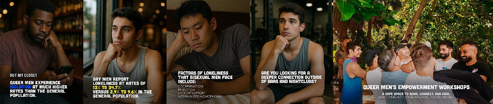 Queer Menās Empowerment Workshops, offering connection, mentorship, and healing outside of bars and nightclubs.